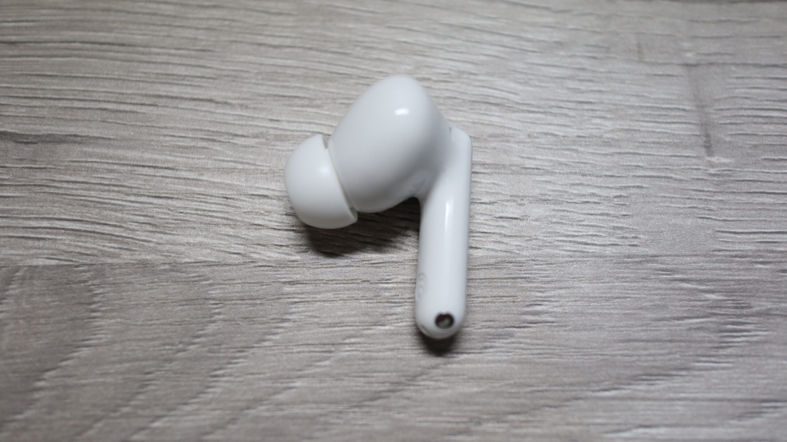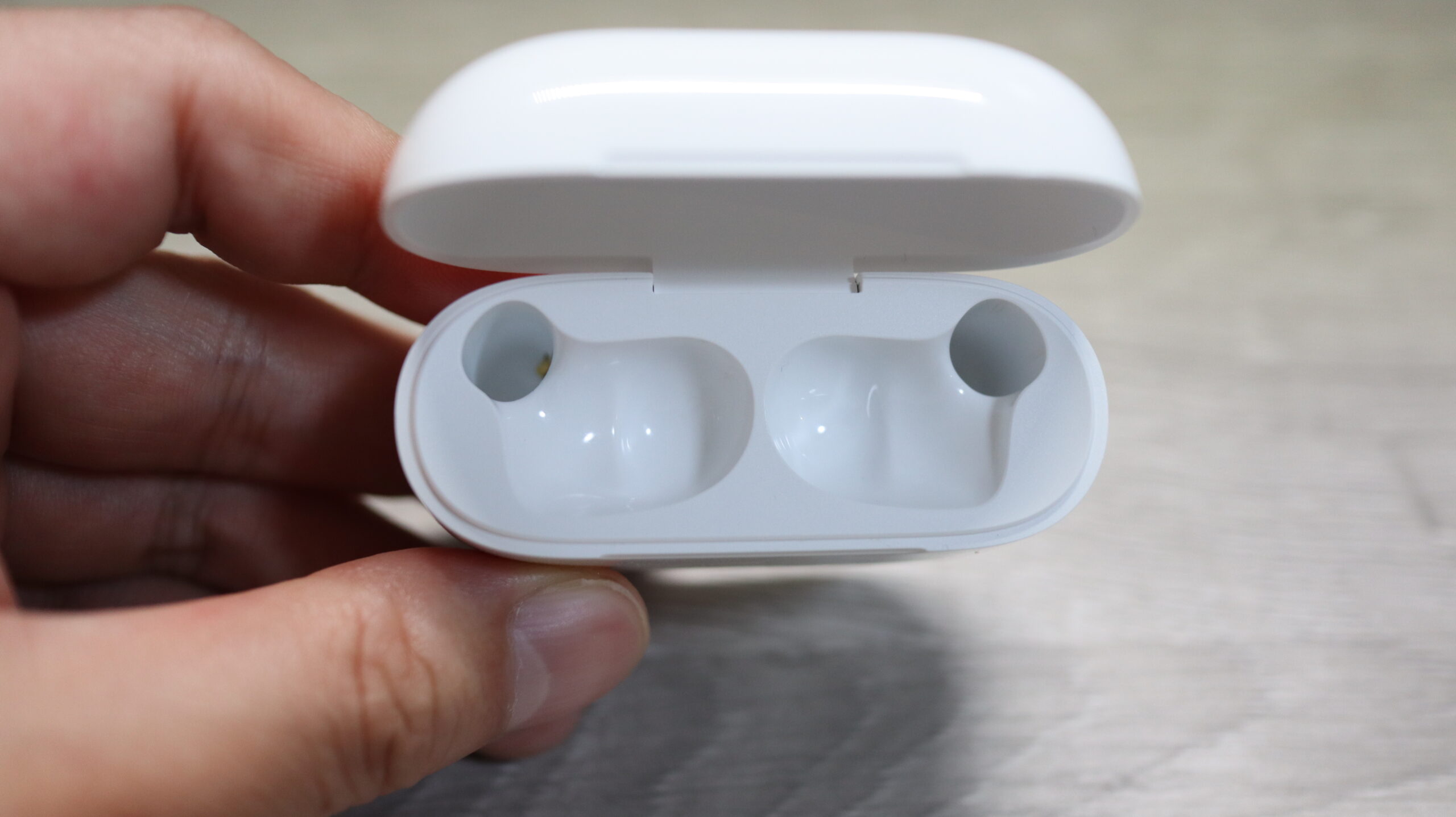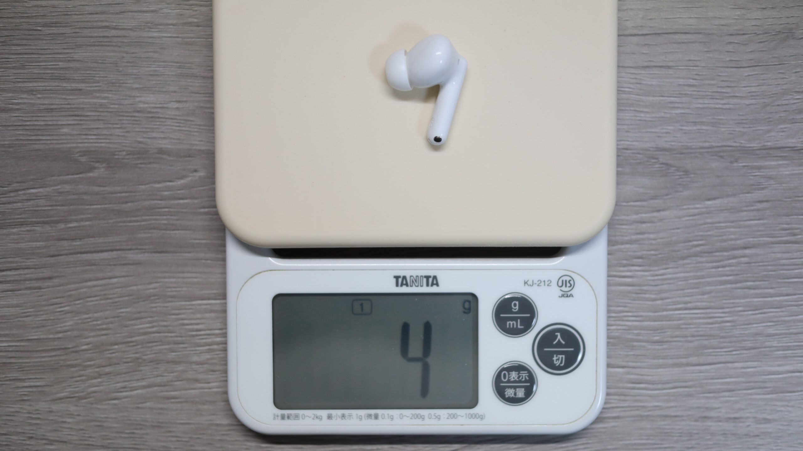 キッチンスケールでの実測値は片耳4g、両耳で9g、ケースとイヤホン両方で44gです。