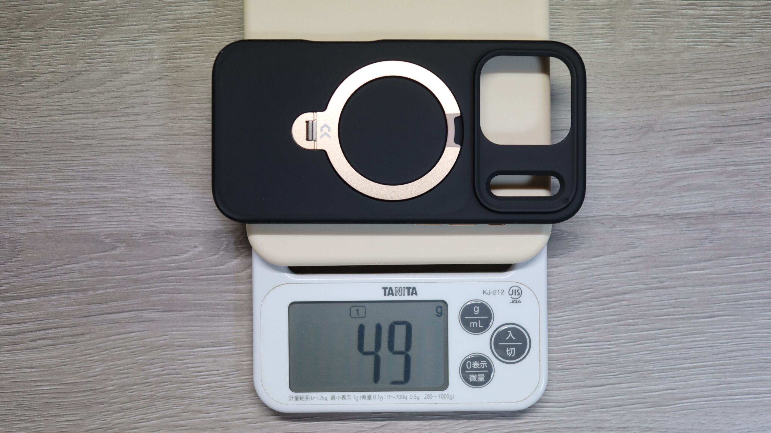 キッチンスケールでの実測値は49gです。iPhone17 Proは206gなので組み合わせると約255gになります。