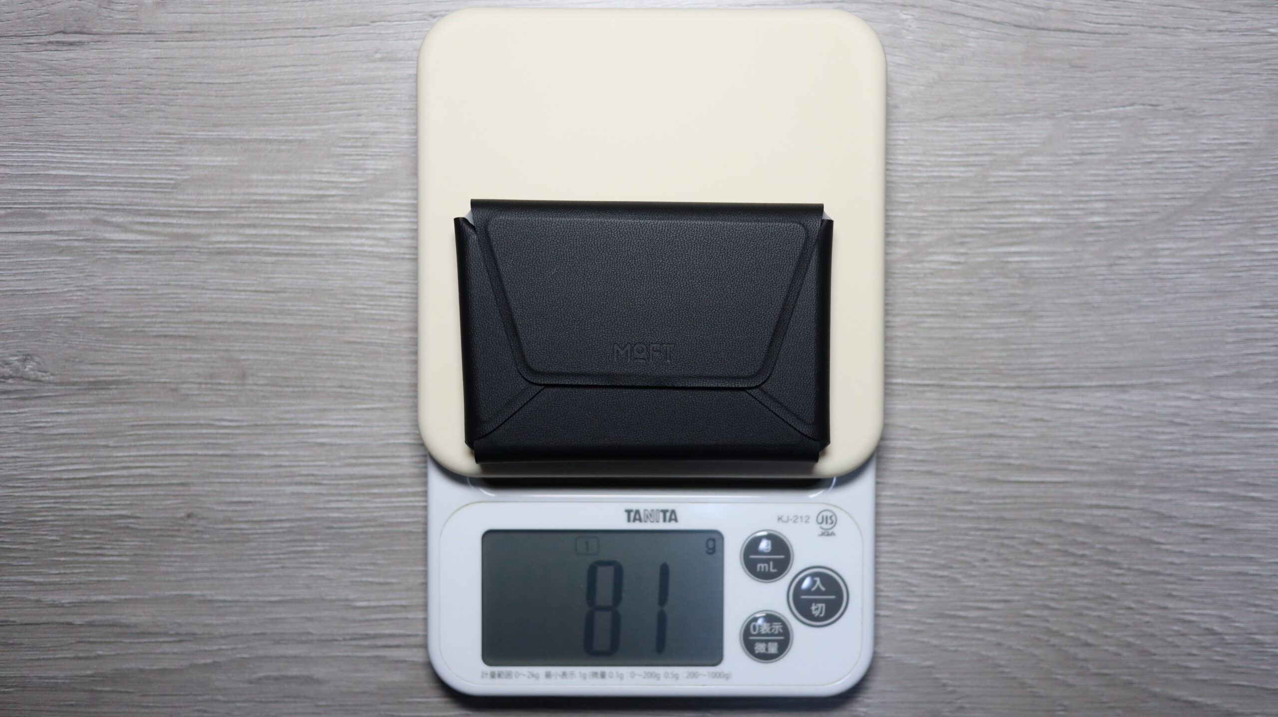 キッチンスケールでのMOFT 多機能カードケース&スタンドの実測値は81gです。サイズは100*70 mmです。