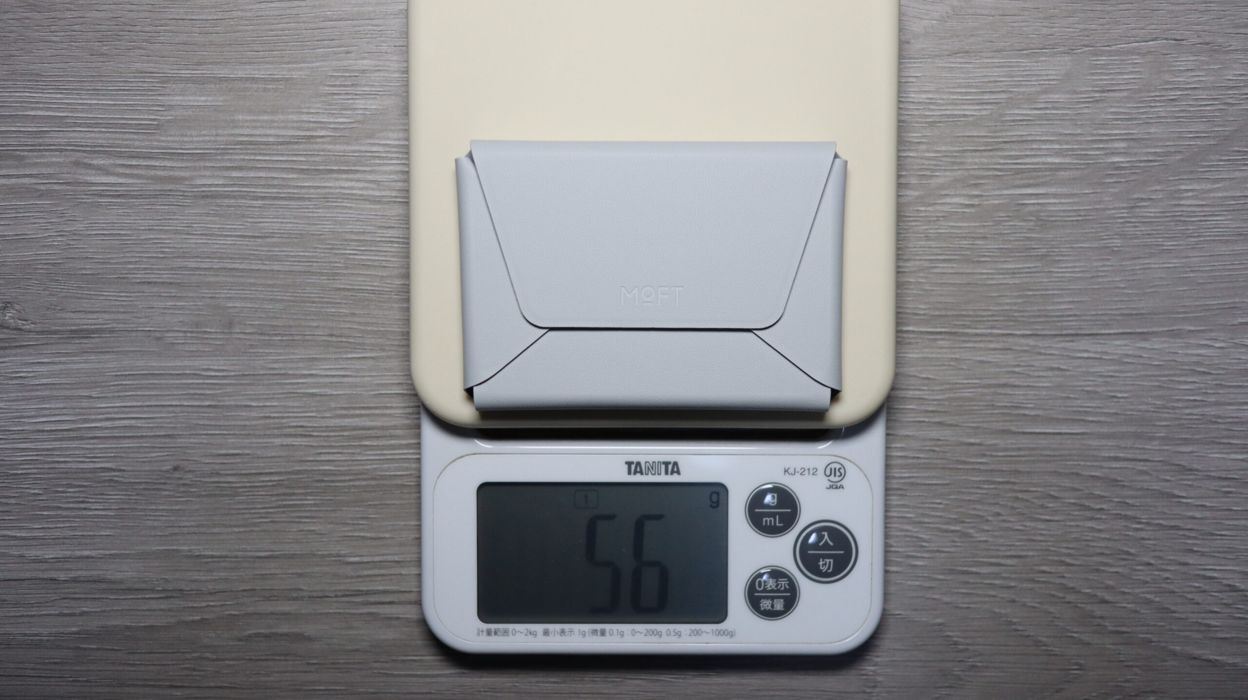MOFT 多機能カードケースのキッチンスケール実測値は56gです。サイズは100*70 mmです。