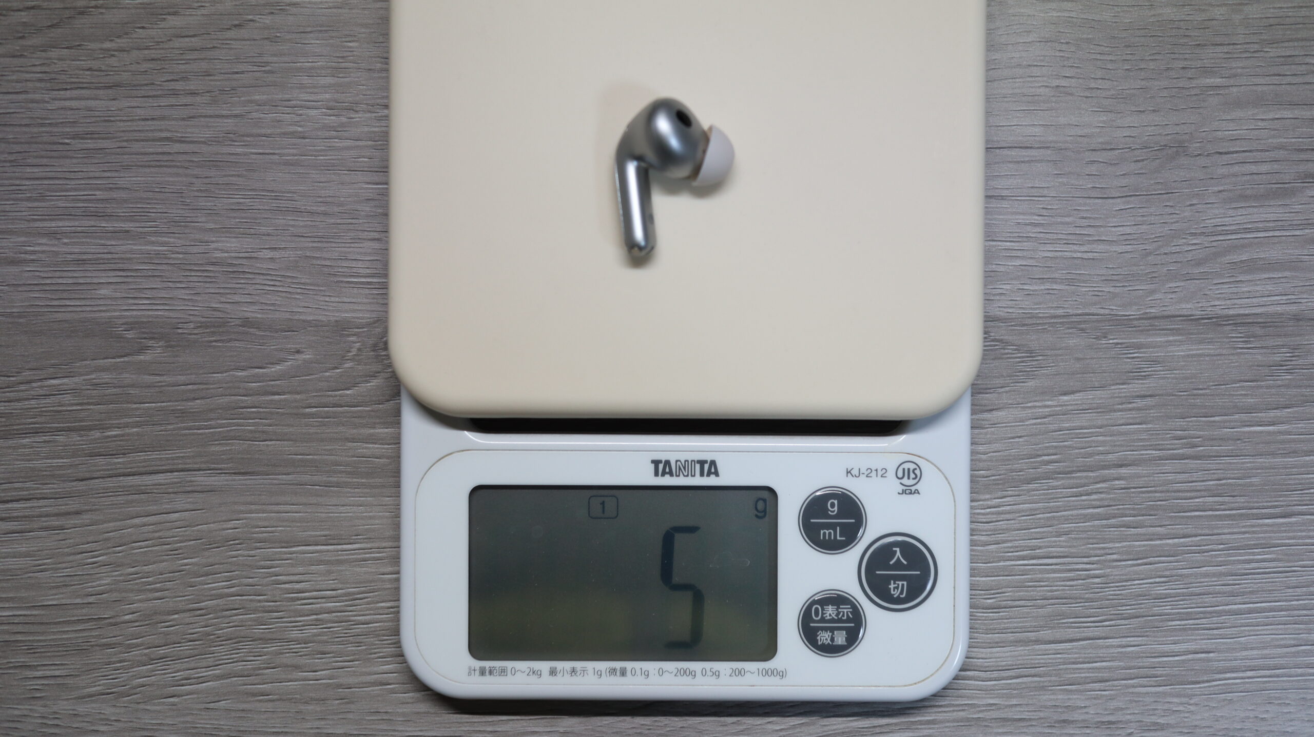 キッチスケールでの実測値は片耳分のイヤホンが5g、両耳分で10g、ケース込みで51gです。
