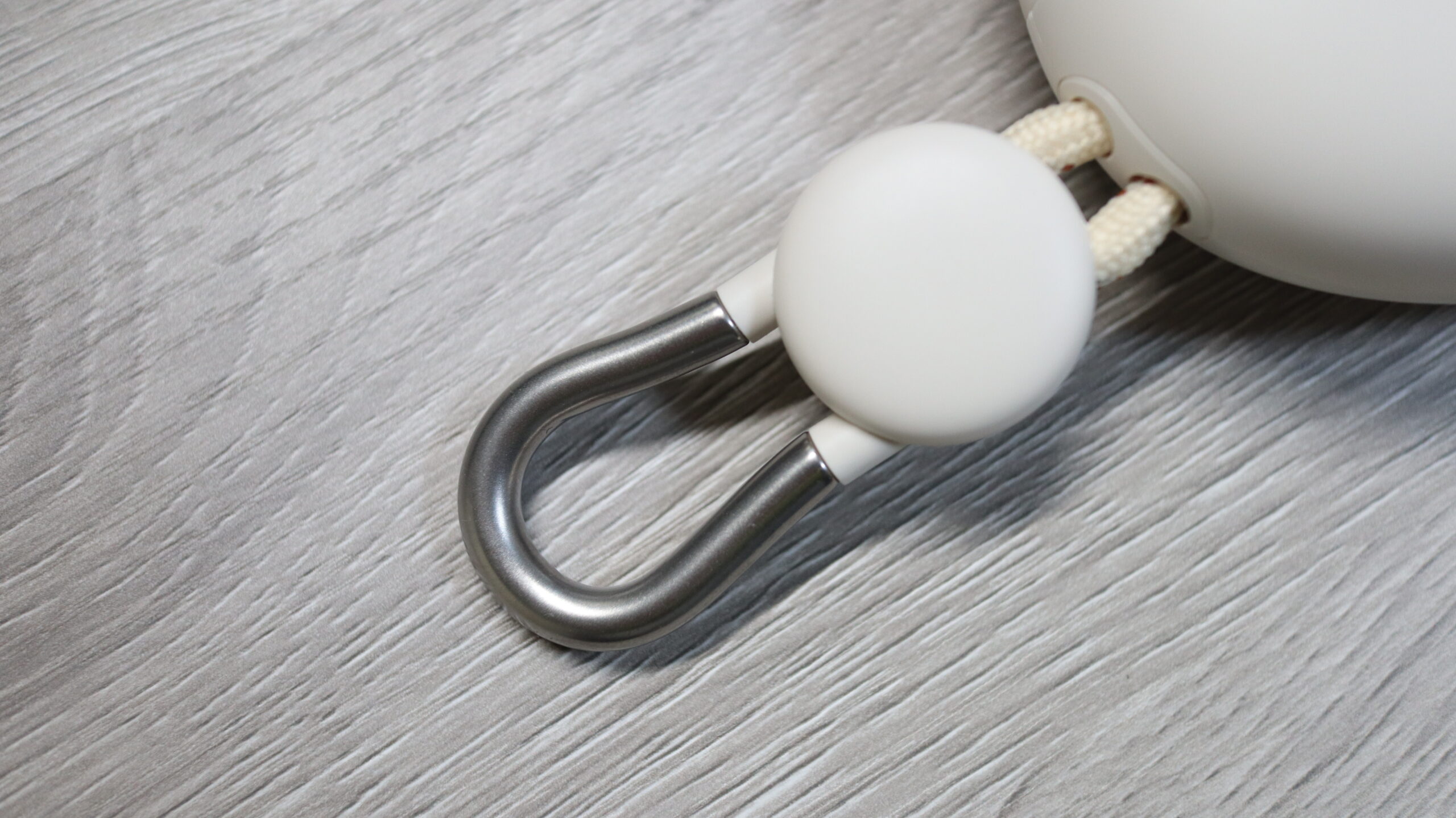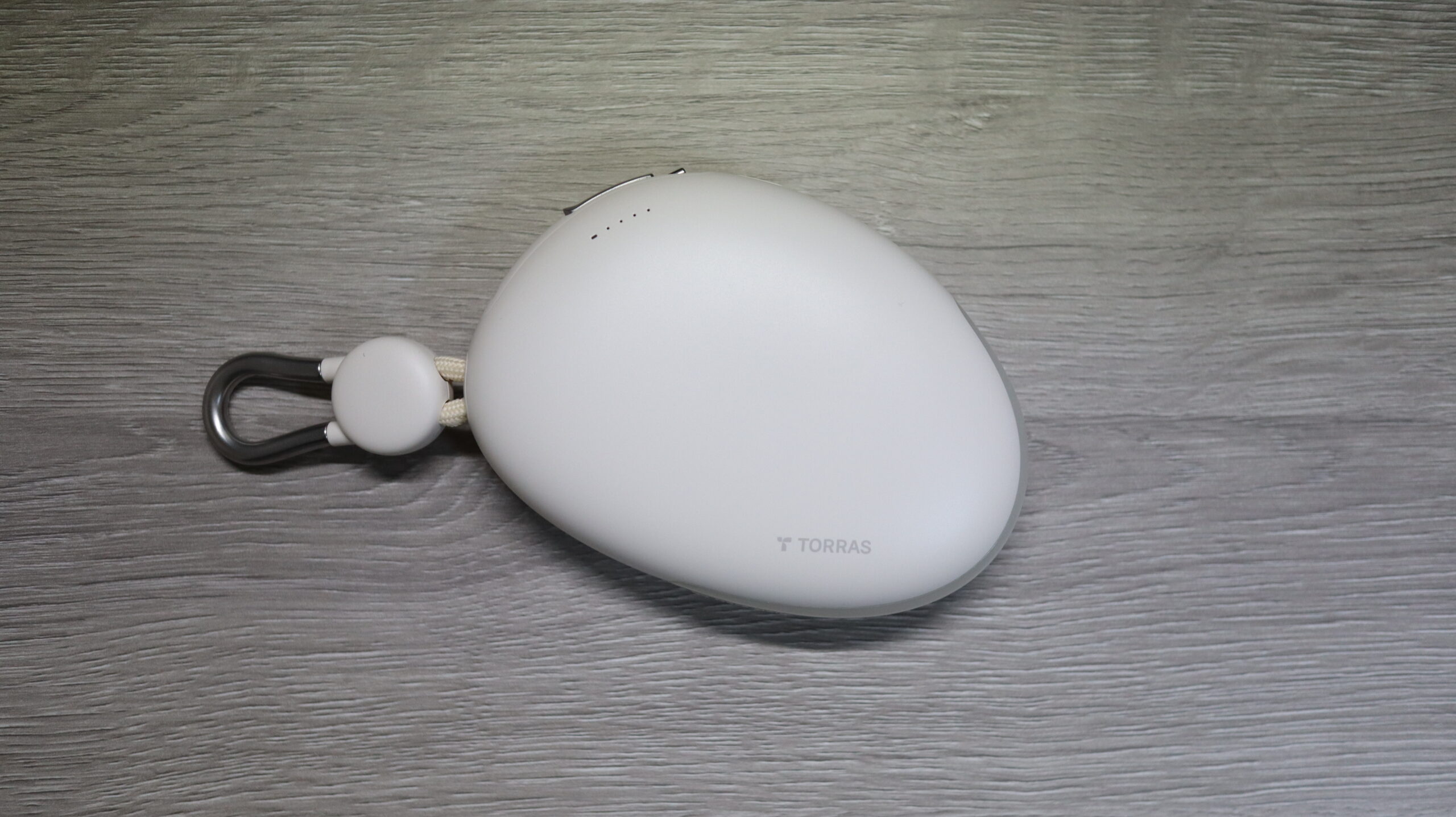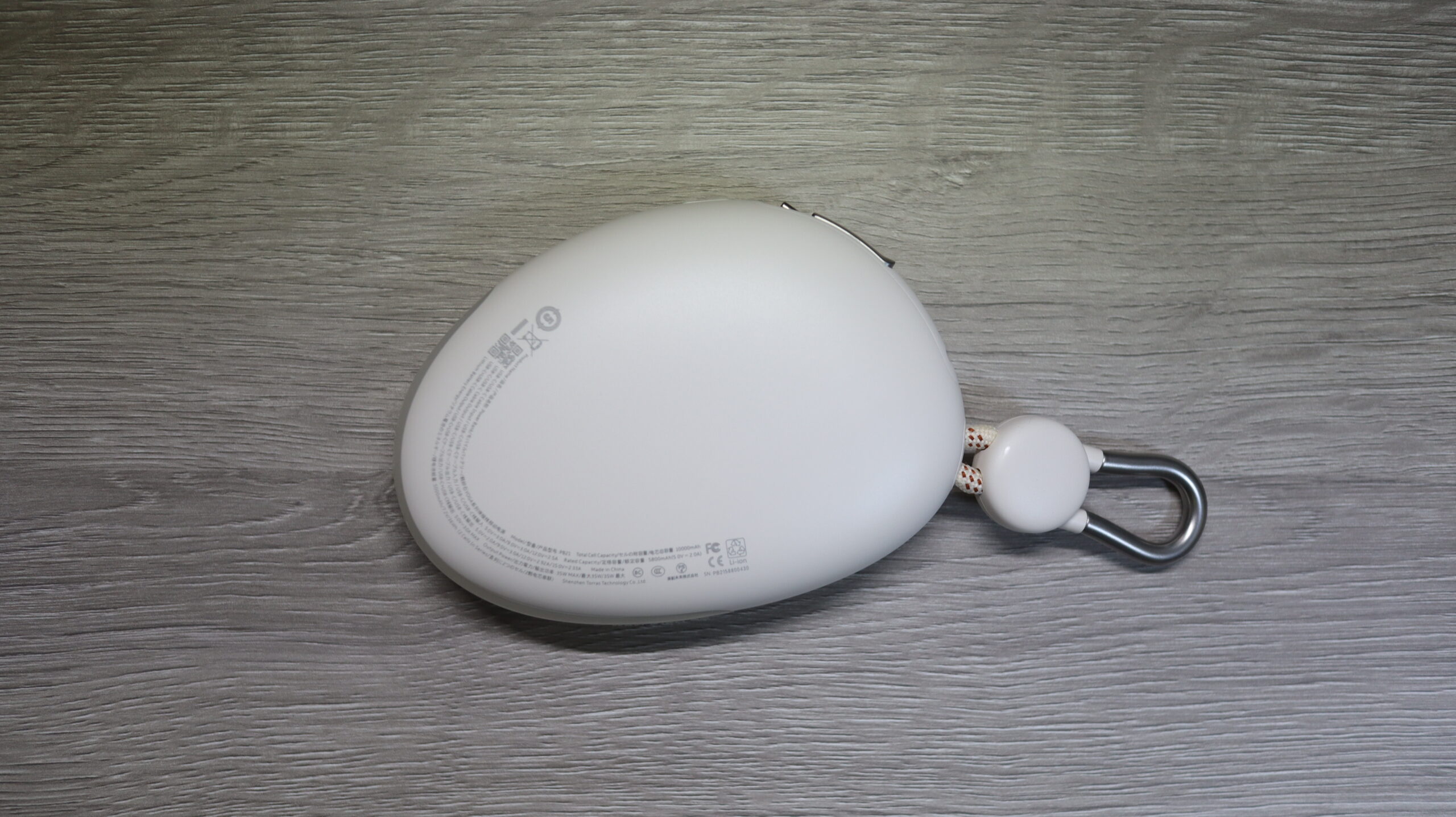 モバイルバッテリーとしては珍しいカラビナ付きで流線形のデザイン。