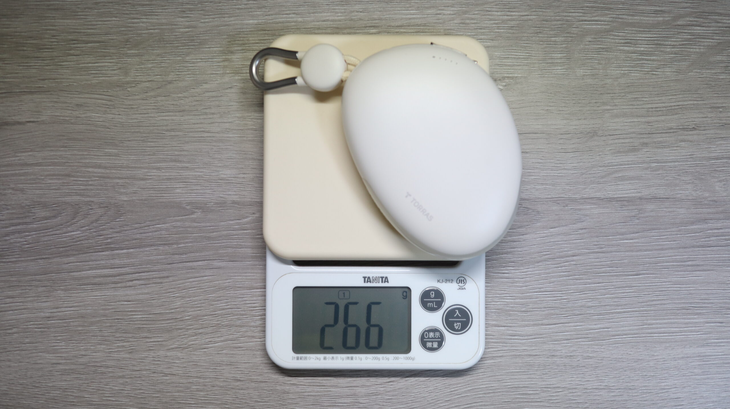 カラナビ含むサイズは18.5 × 10 × 3cmです。キッチンスケールでの重量実測値は266です。