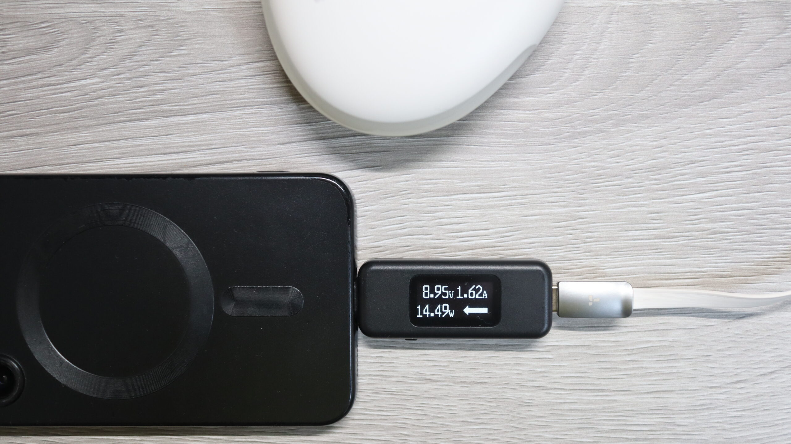 複数同時充電時の仕様は不明ですが、ポート側を使用した充電は5W前後(バッテリー残量数%のスマホ)でした。