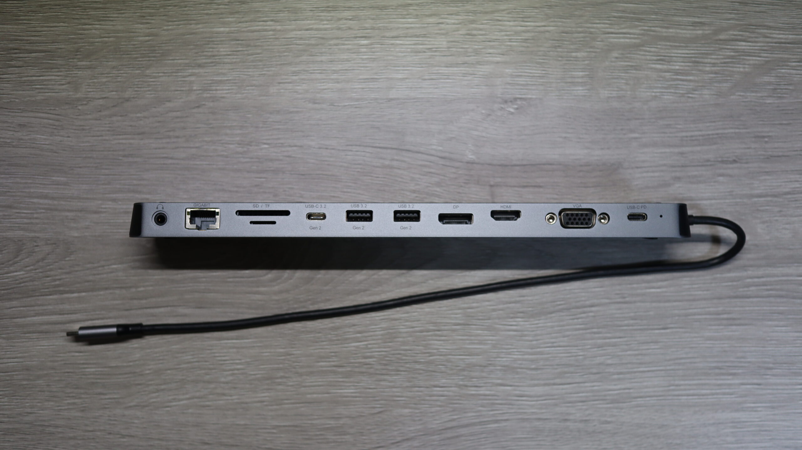 ポートは11個と豊富で、左から3.5mmイヤホン、イーサネットポート、SD/TFスロット、USB TypeC3.2、USB TypeA3.2×2、DP、HDMI、VGA、USB TypeC PDがあります。