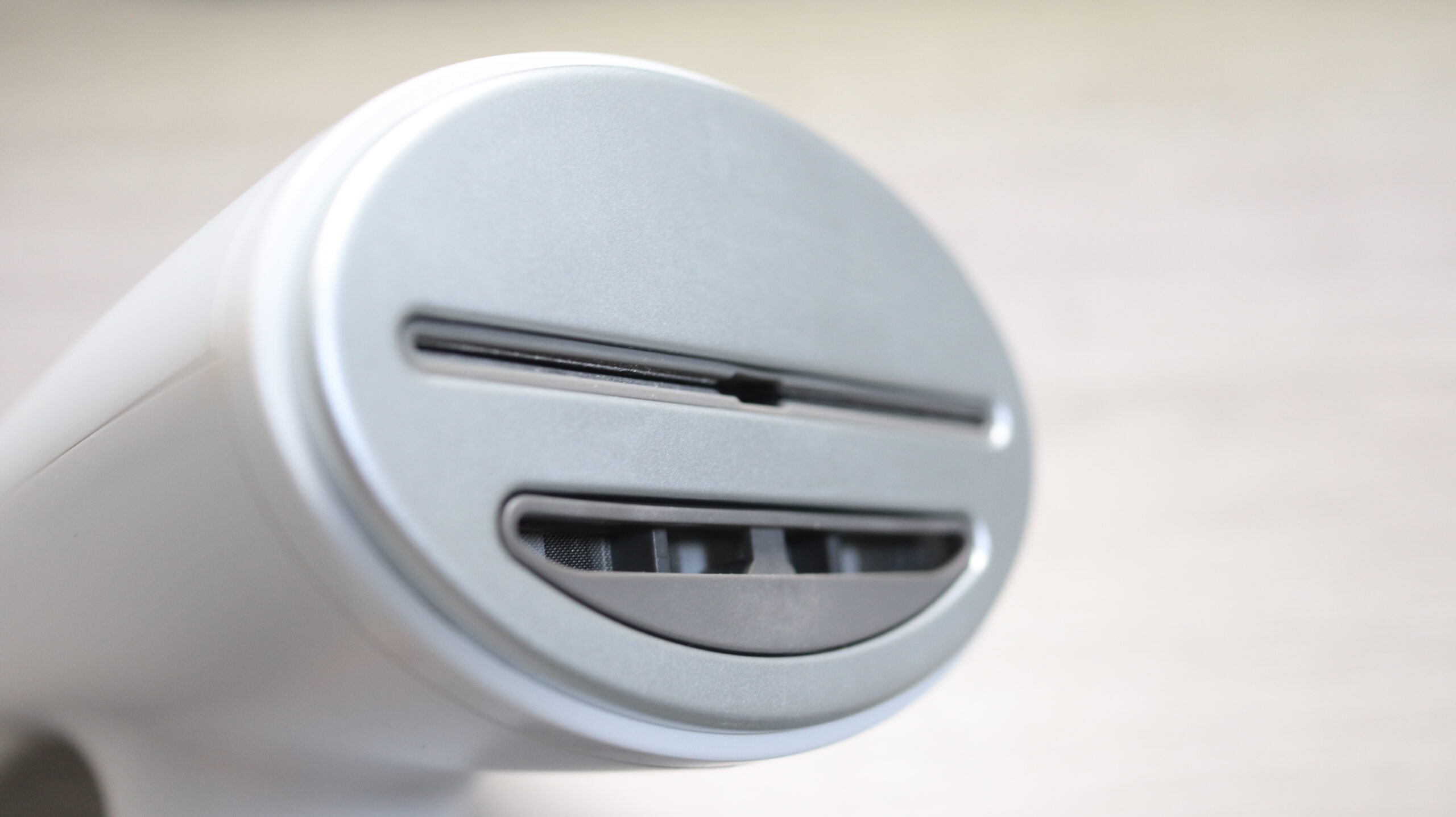 スチーマーの重要な機能部分のアイロンパネルや吸引口などもかなりシンプルな作りになっています。上がスチームを噴出、下が吸引になっています。