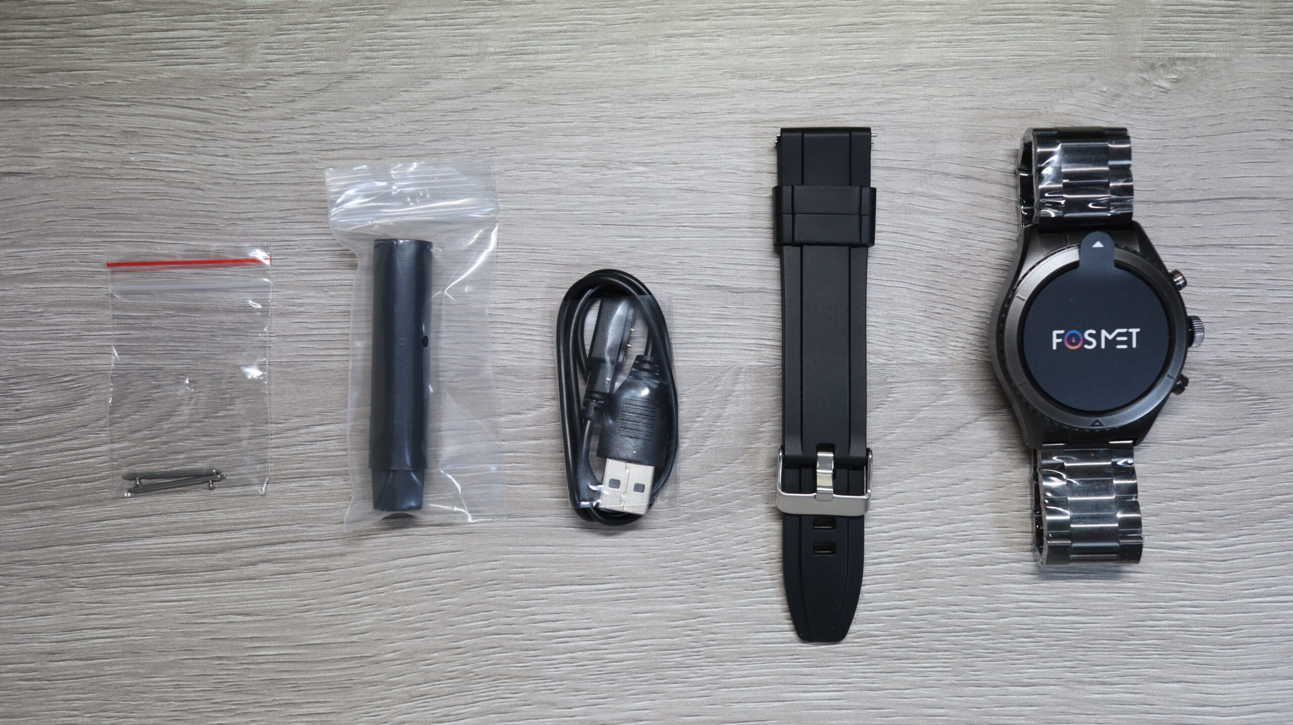 スマートウォッチ ×1、シリコンバンド ×1、充電ケーブル ×1、日本語取扱説明書 ×1、交換用バネ棒(ピン) ×1ペア、ストラップリムーバー×1。