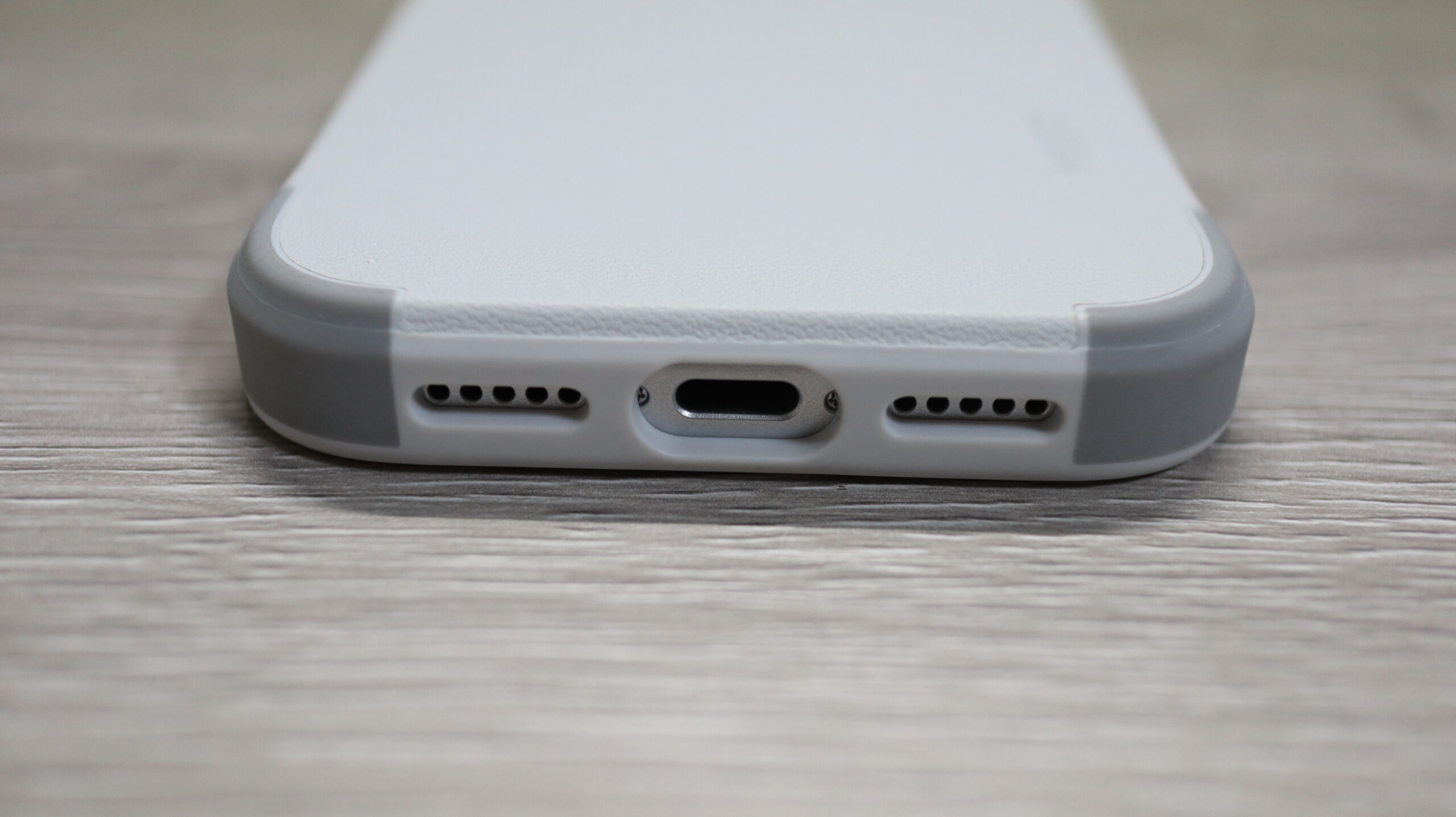 底面の充電ポートとスピーカー周りです。角はガードされていますが、ポート部分は大きく開口しているため、太めのUSB-Cケーブルでも干渉せずに挿し込むことができます。スピーカー穴を塞ぐこともありません。