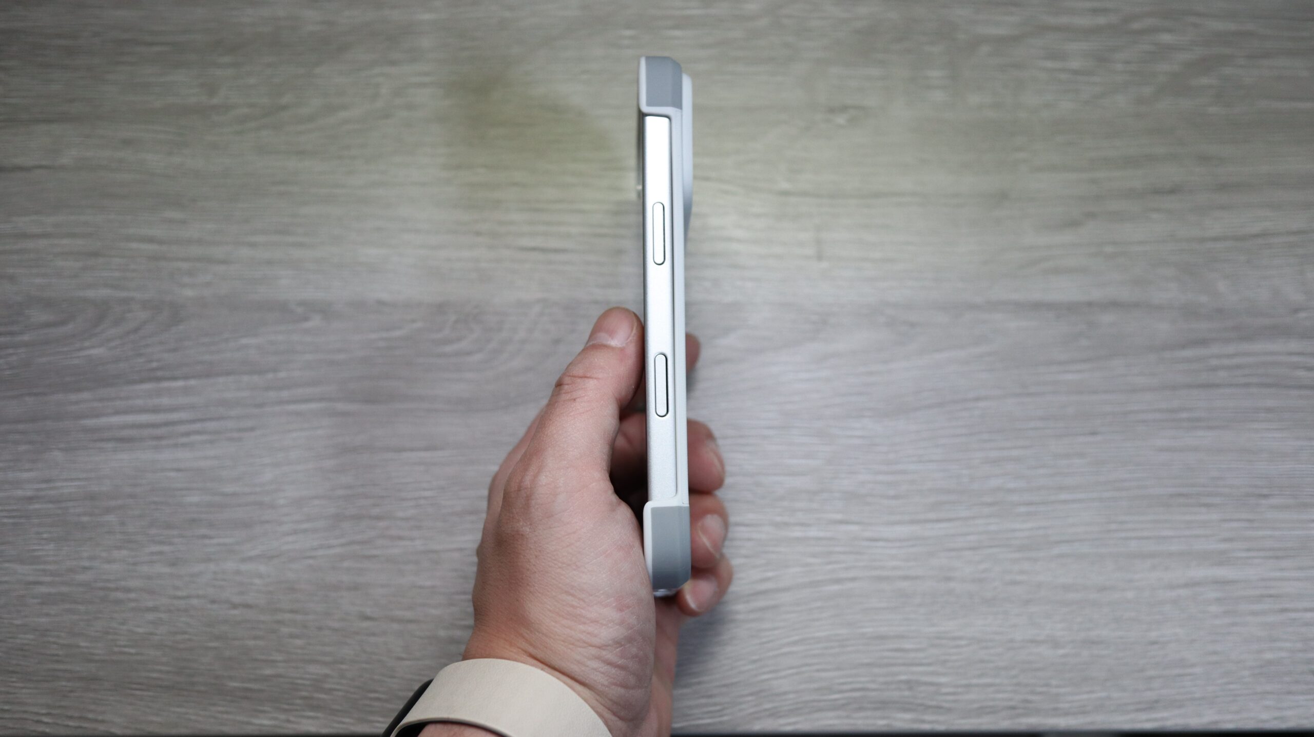 このケース最大の特徴である「側面オープン」のデザインがよくわかります。上下の角(コーナー)はしっかりとTPUとPC素材のフレームで保護されていますが、中央部分は大胆にカットされています。これにより、ケースをつけても横幅が広がらず、iPhone本来のサイズ感に近くなっています。
