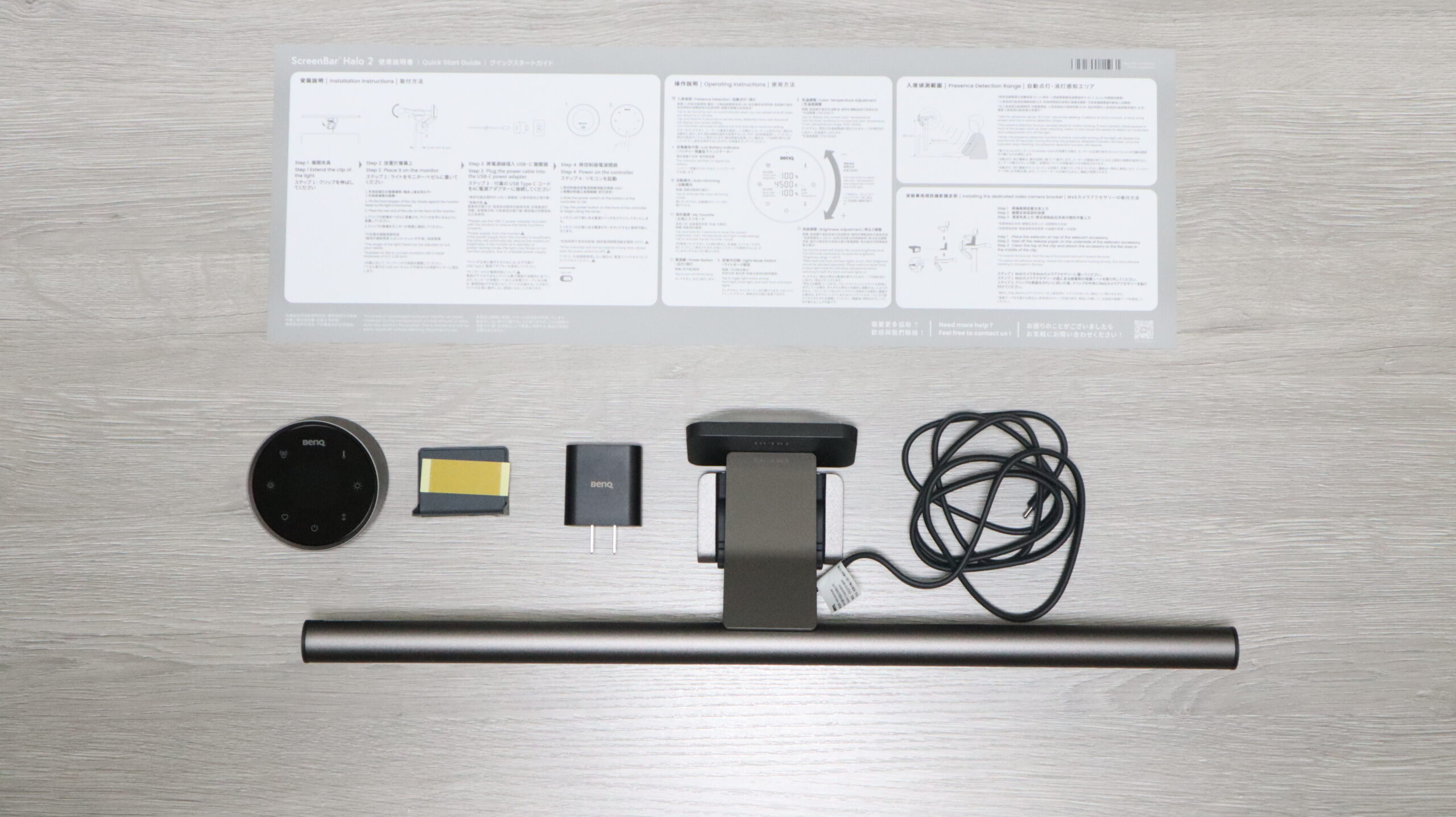 ScreenBar Halo 2本体、ウェブカメラアクセサリー、リモコン、充電器、説明書