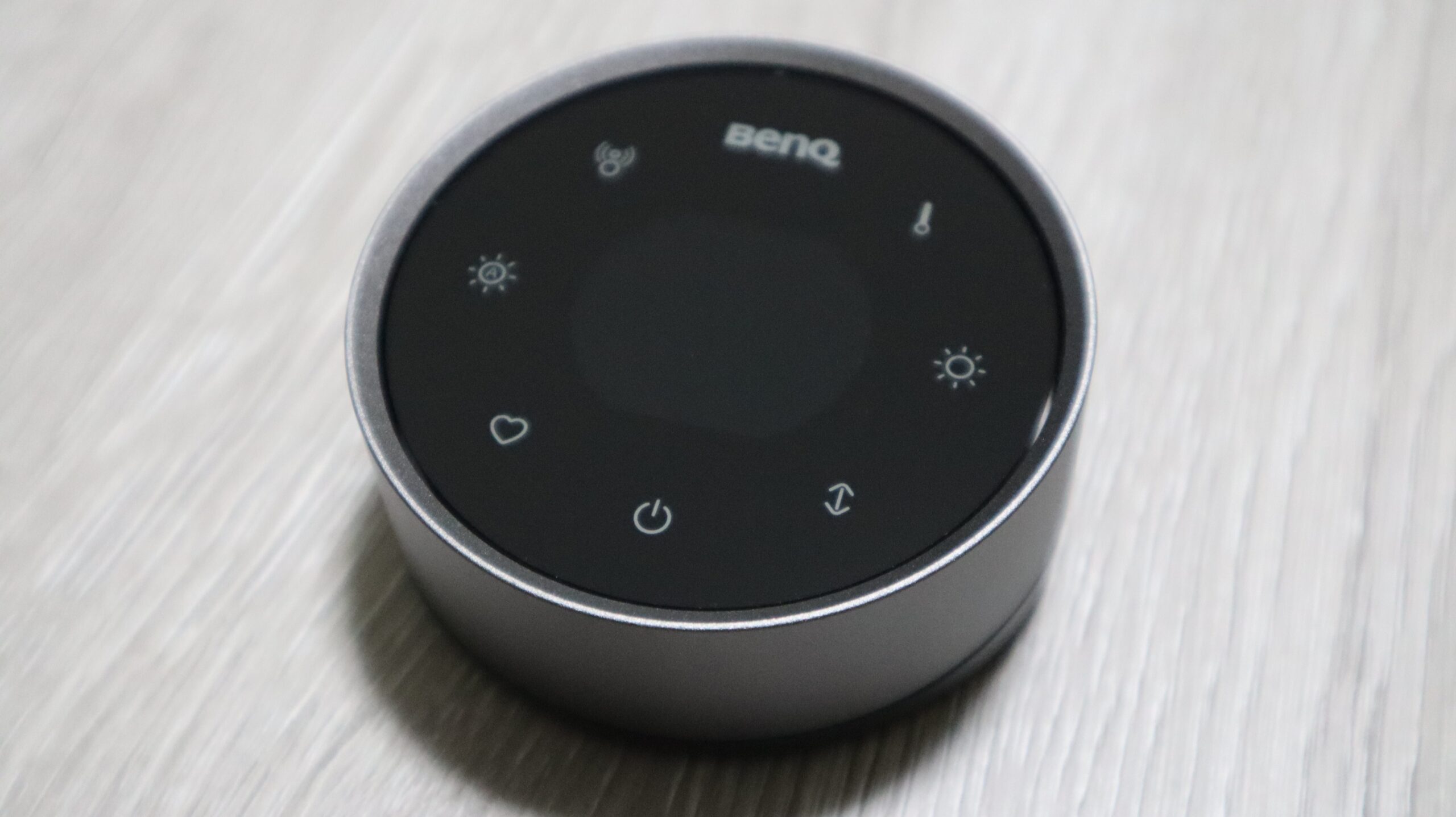 リモコン機能は豊富で、BenQロゴの横から、色温度調整、明るさ調整、ライトモード設定、点灯/消灯、お気に入りモード、自動調光、自動点灯/消灯が設定できます。